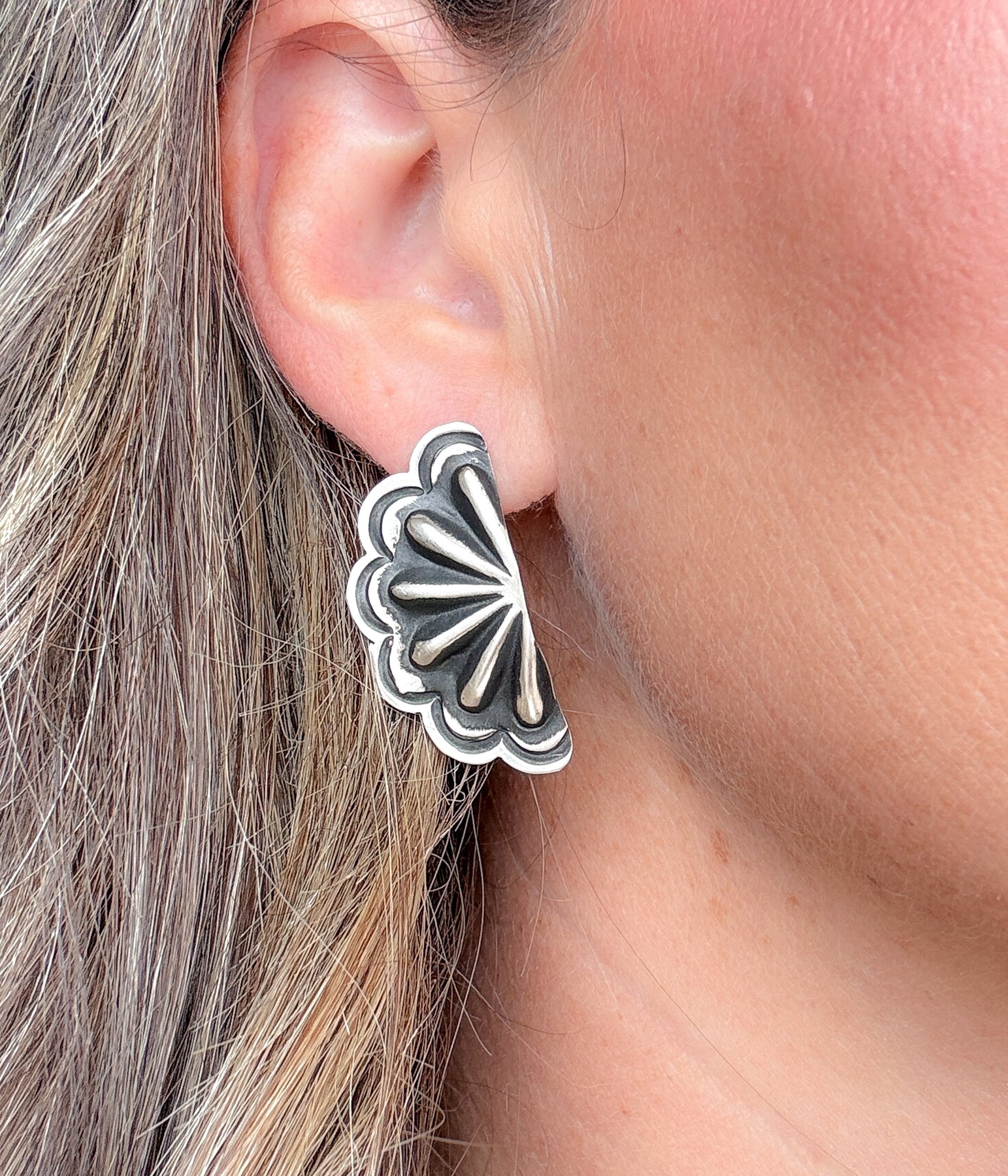 Crafted from .925 Sterling Silver, these Navajo made half concho earrings will match everything in your closet. Measuring 1 inch in length, they offer a classic presence while remaining lightweight and comfortable to wear.