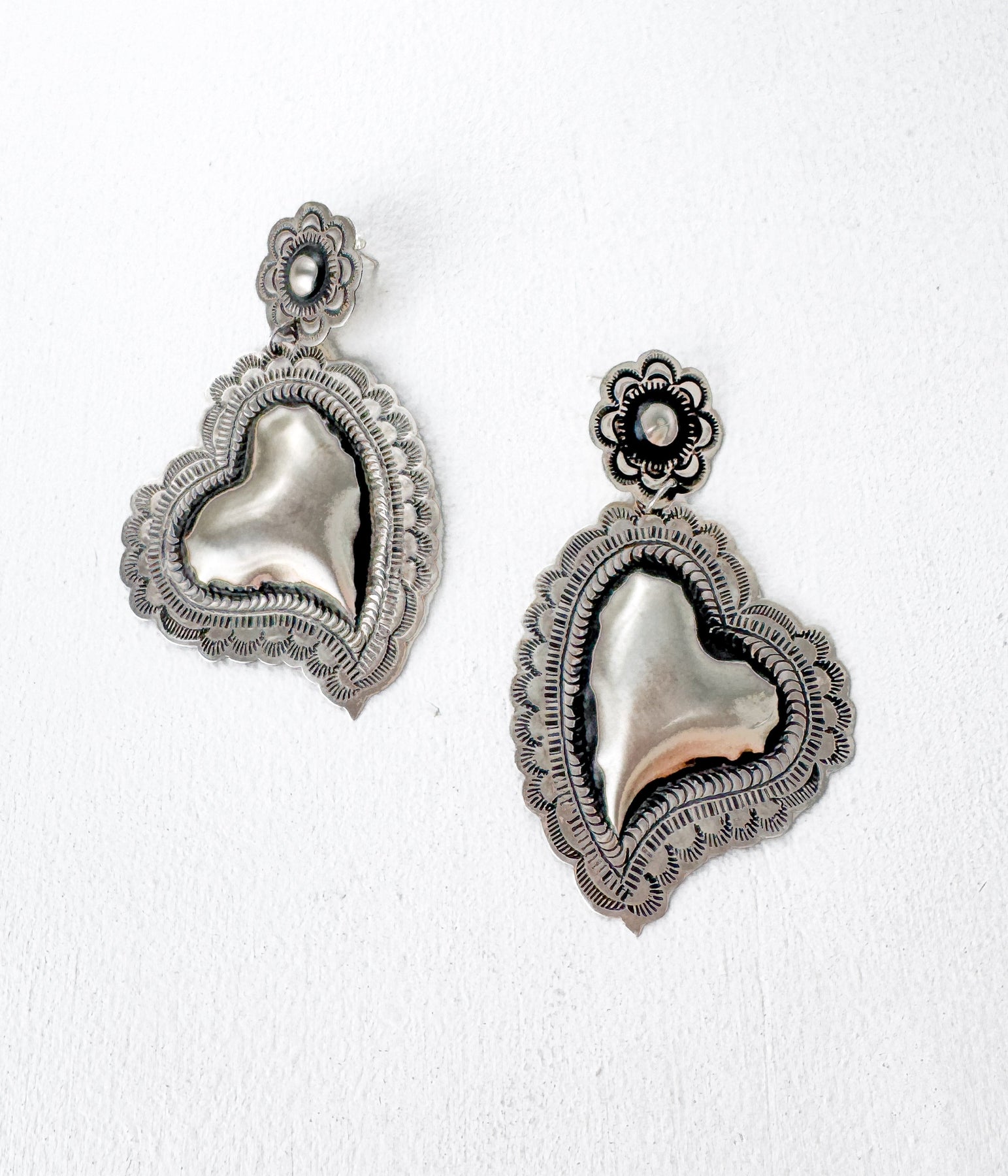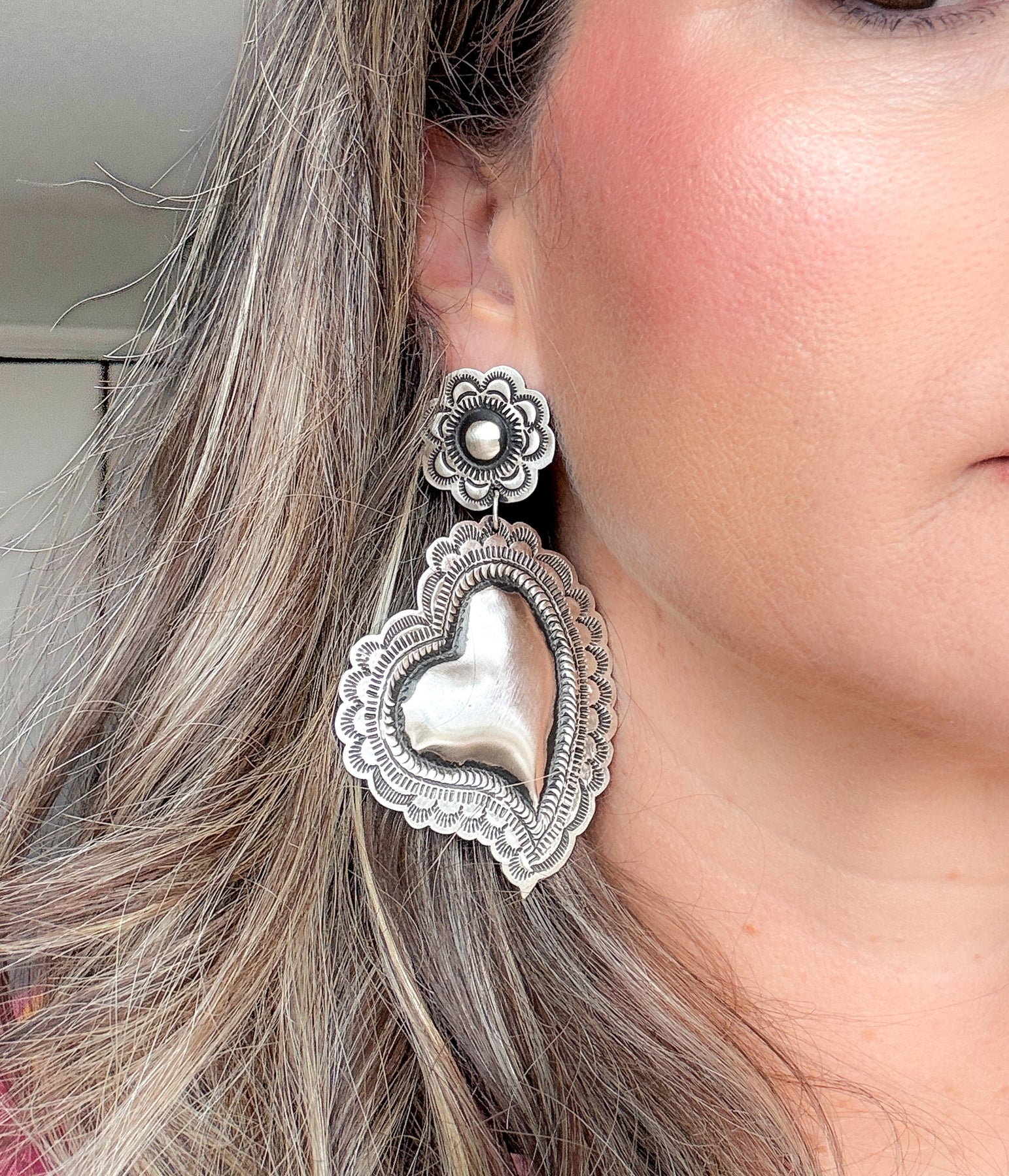 Elevate your jewelry collection with these stunning Navajo-made Sterling Silver Heart Earrings, a timeless blend of bold design and classic elegance. Handmade by renowned Navajo artist L. Tahe, each piece is stamped with authenticity, showcasing the artistry and heritage of Native American craftsmanship.