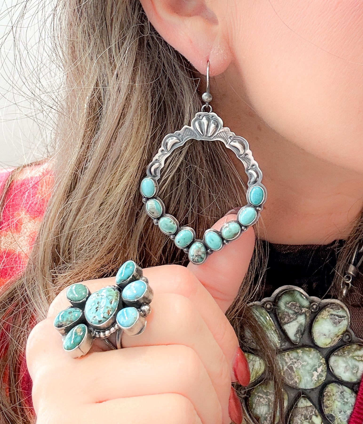 Despite their statement size, these earrings are surprisingly comfortable to wear. They move effortlessly with you, catching the light as you go, whether you’re dressing up a simple blouse or pairing them with layers of turquoise for a bold, collected look. These are the kind of earrings that don’t just complete an outfit — they tell a story.