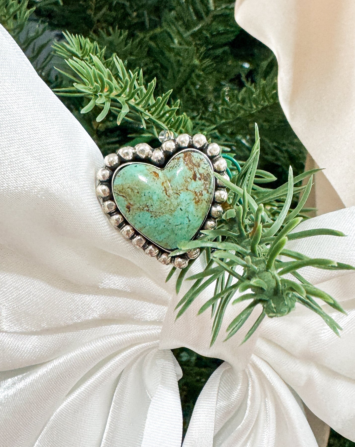 A love story in silver and stone — The Desert Heart Ring captures the soulful beauty of Navajo craftsmanship with an unmistakable romantic touch. Hand-forged by Navajo artist Robert Begay, this one-of-a-kind piece features a heart-shaped turquoise stone, rich with veins of golden brown matrix that tell their own desert story.