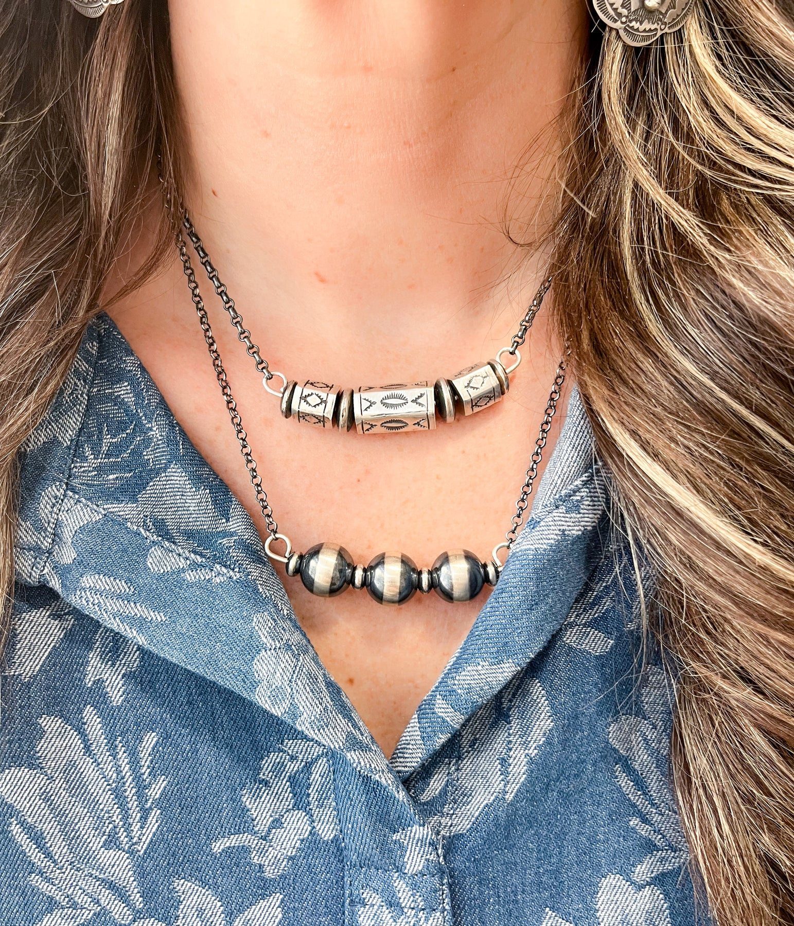 There’s something about Navajo pearls that instantly softens a look — that quiet shimmer, that elegant weight, that unmistakable artisan feel. This necklace brings all of that beauty forward in a clean, modern way. Each 12mm sterling silver pearl is machine-made for perfect uniformity, then hand-strung by Navajo artists with the kind of intention and craftsmanship you can feel the moment you put it on.