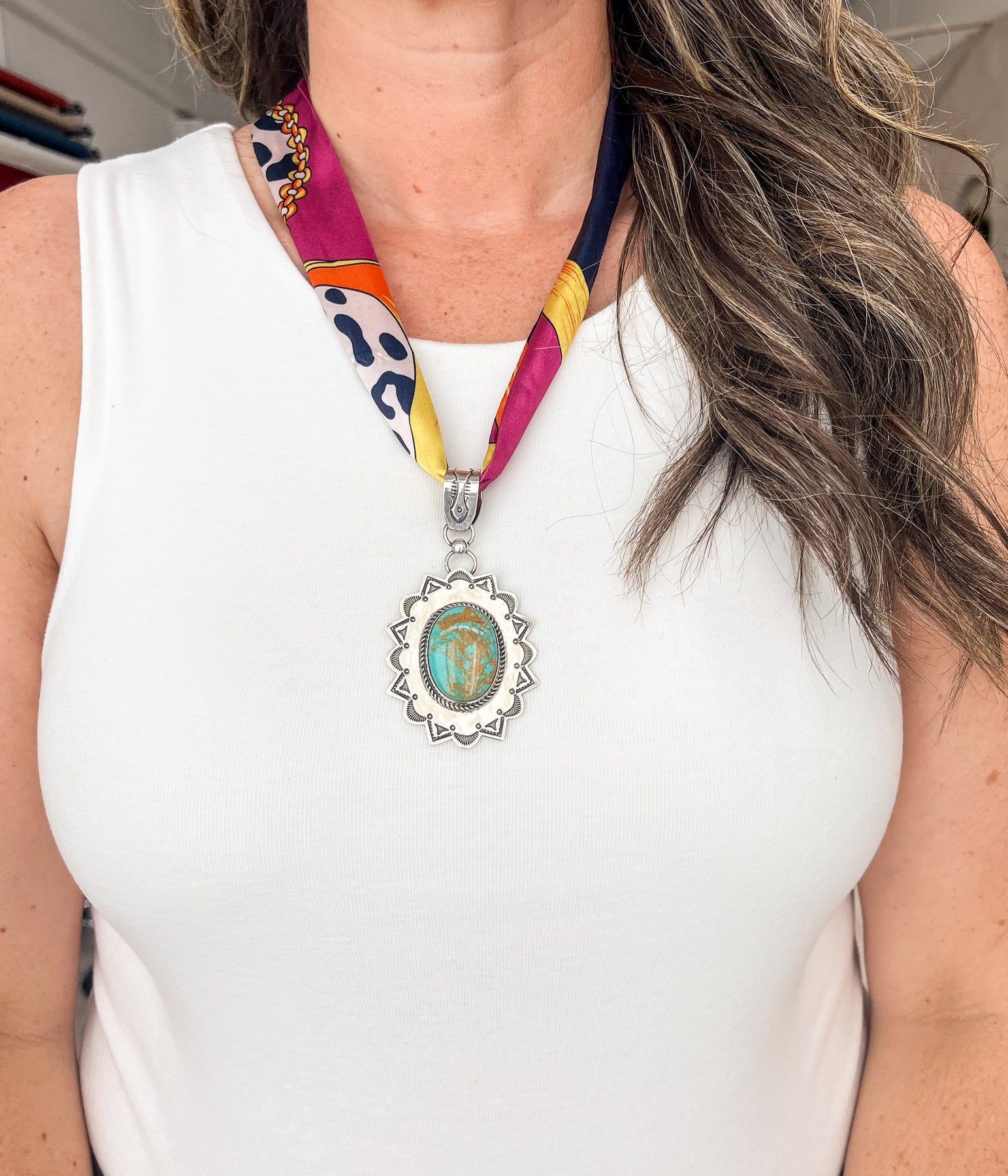 Perfectly versatile, this pendant pairs beautifully with classic Navajo pearls for a traditional look or adds a touch of elegance when styled with your favorite silk scarf. Its bold yet refined design makes it an ideal accessory for both everyday wear and special occasions.